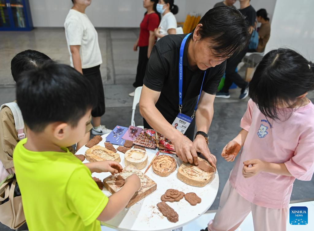 An artist teaches children to make clay sculptures at the exhibition area of Shanxi Province during the 21st China (Shenzhen) International Cultural Industries Fair in Shenzhen, south China's Guangdong Province, May 24, 2025. Opened here on Thursday, the five-day event is being held across eight exhibition halls -- three comprehensive spaces and five specialized areas. Activities related to traditional culture and cultural heritages attracted many young visitors. [Photo/Xinhua]