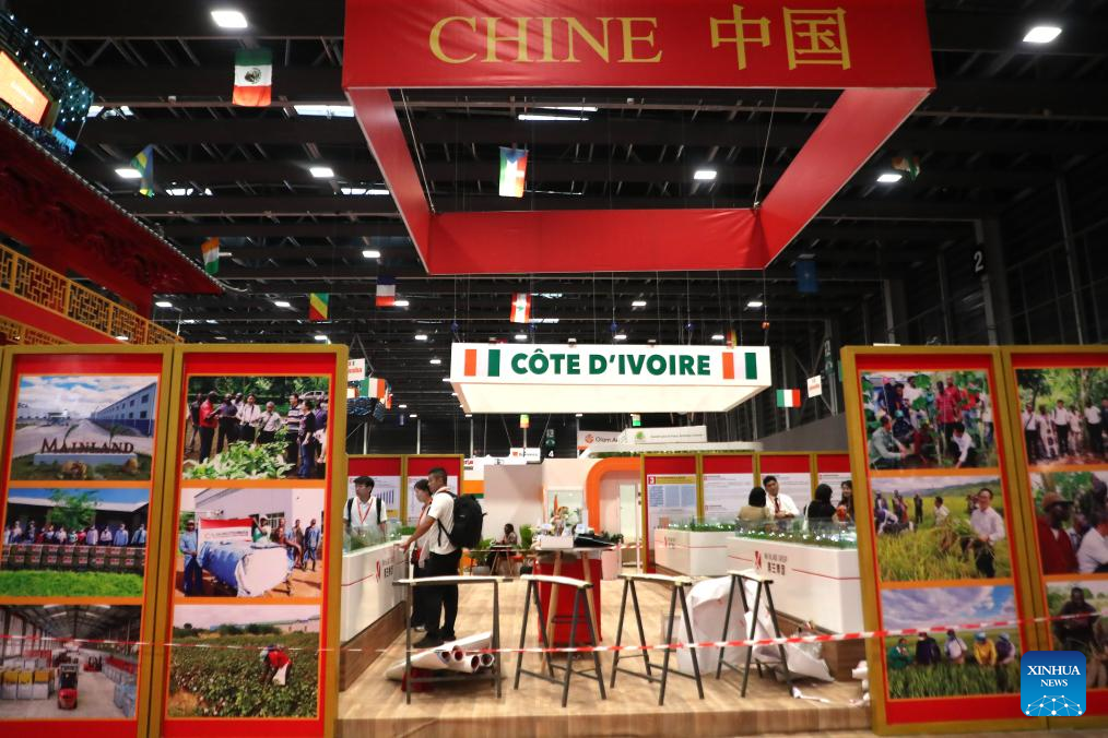 People visit the Chinese Pavilion during the 7th International Exhibition of Agriculture and Animal Resources (SARA 2025) at the Abidjan Exhibition Centre, Abidjan, Cote d'Ivoire, on May 23, 2025. (Photo by Yvan Sonh/Xinhua)