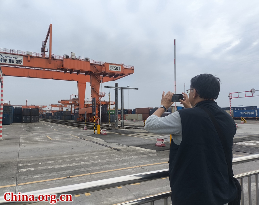 Luis Rogelio Rivero Chong photographs shipping containers at a freight train station in southwest China's Chongqing, May 24, 2025. [Photo by Xu Xiaoxuan/China.org.cn]