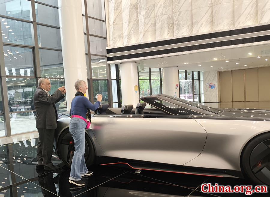 Rosalind Oliver (R) and Elsawy Elsawy Ahmed photograph a concept vehicle at the Changan Automobile Global R&D Center in southwest China's Chongqing, May 24, 2025. [Photo by Xu Xiaoxuan/China.org.cn]