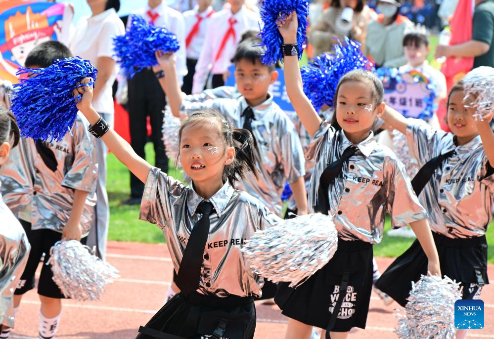 Pupils perform cheerleading dance ahead of the International Children's Day at a school in Qingdao, east China's Shandong Province, May 30, 2025. [Photo/Xinhua]