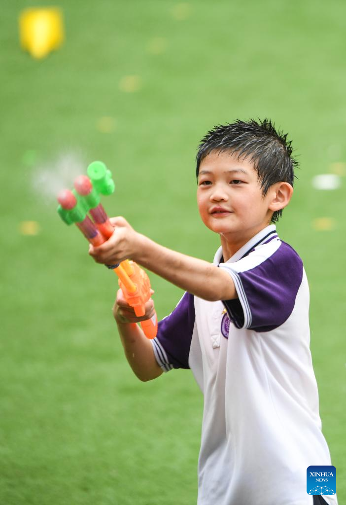 A pupil plays with a toy water gun during a celebration event ahead of the International Children's Day at a school in southwest China's Chongqing, May 30, 2025. [Photo/Xinhua]