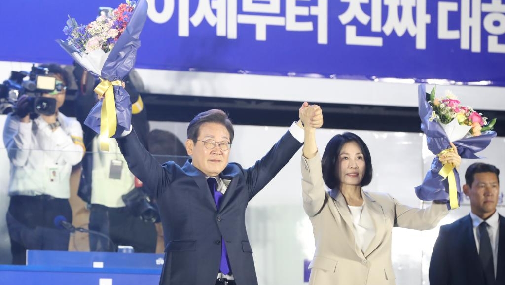 Lee Jae-myung and his wife Kim Hye-kyung celebrate at the National Assembly in Seoul, South Korea, on June 4, 2025. [Photo/Xinhua]