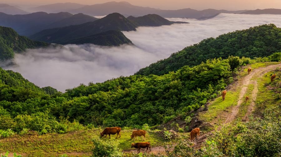 An aerial drone photo taken on May 27, 2023, shows a view of Huangmaojian mountain in Xinxian County, central China's Henan Province. (Photo by Han Jiadong/Xinhua)