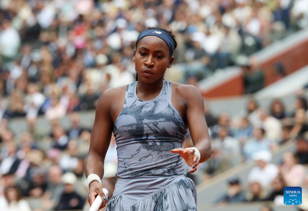 Coco Gauff reacts during the women's singles final match between Aryna Sabalenka of Belarus and Coco Gauff of the United States at the French Open tennis tournament at Roland Garros, Paris, France, June 7, 2025. (Xinhua/Gao Jing)