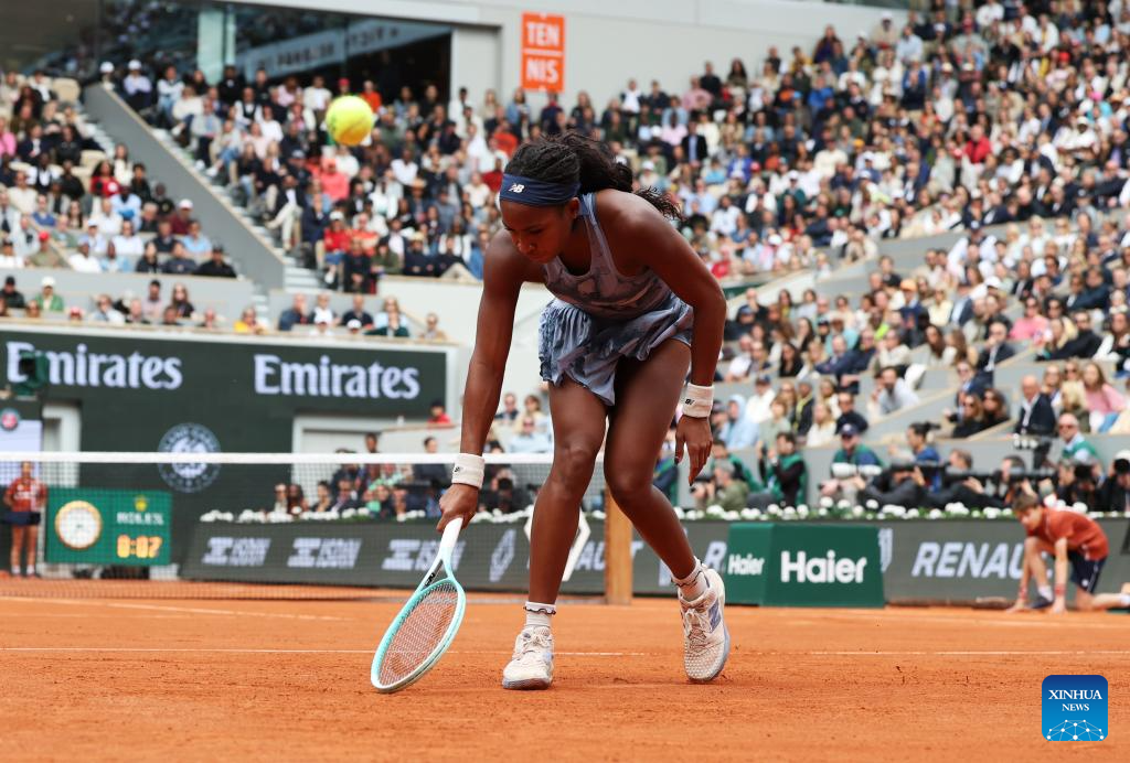Coco Gauff reacts during the women's singles final match between Aryna Sabalenka of Belarus and Coco Gauff of the United States at the French Open tennis tournament at Roland Garros, Paris, France, June 7, 2025. (Xinhua/Gao Jing)