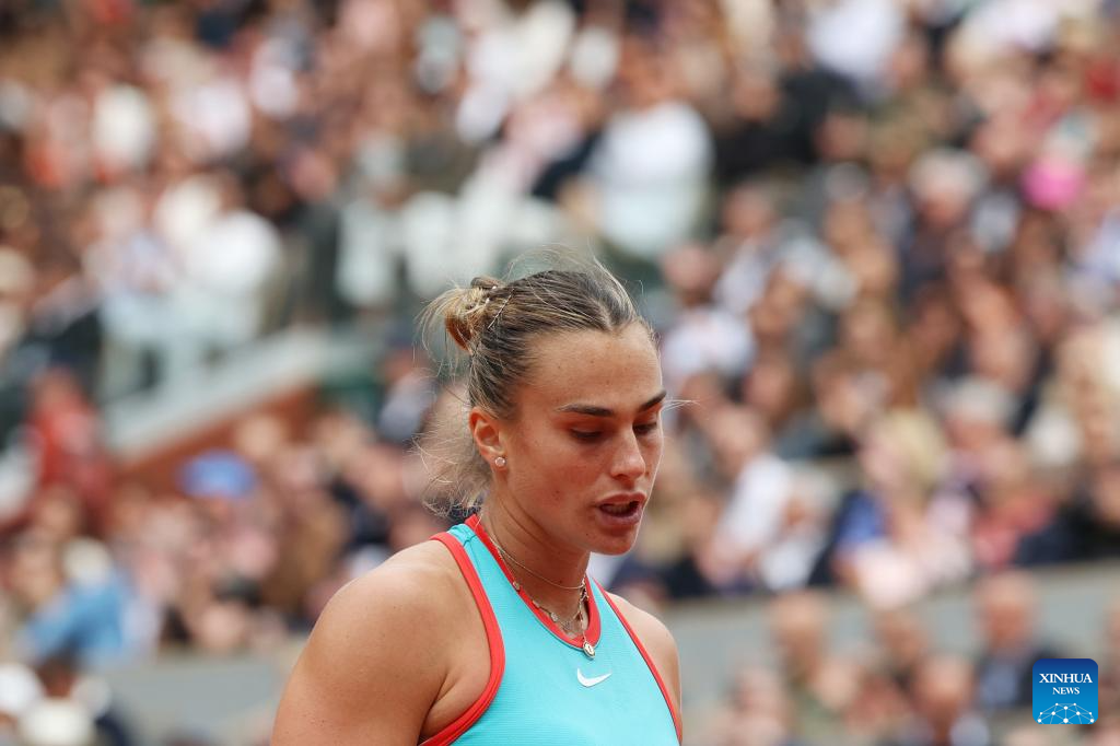 Aryna Sabalenka reacts during the women's singles final match between Aryna Sabalenka of Belarus and Coco Gauff of the United States at the French Open tennis tournament at Roland Garros, Paris, France, June 7, 2025. (Xinhua/Gao Jing)