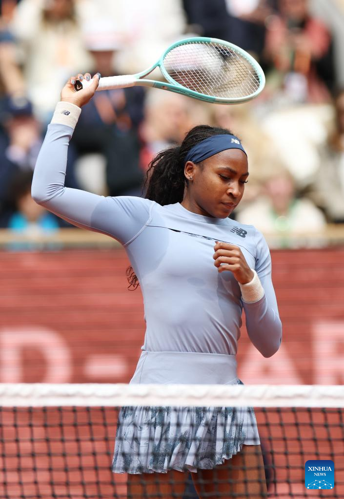 Coco Gauff warms up before the women's singles final match between Aryna Sabalenka of Belarus and Coco Gauff of the United States at the French Open tennis tournament at Roland Garros, Paris, France, June 7, 2025. (Xinhua/Gao Jing)
