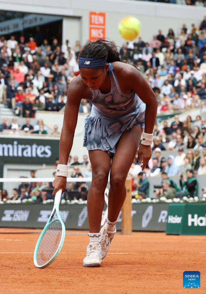Coco Gauff returns a shot during the women's singles final match between Aryna Sabalenka of Belarus and Coco Gauff of the United States at the French Open tennis tournament at Roland Garros, Paris, France, June 7, 2025. (Xinhua/Gao Jing)