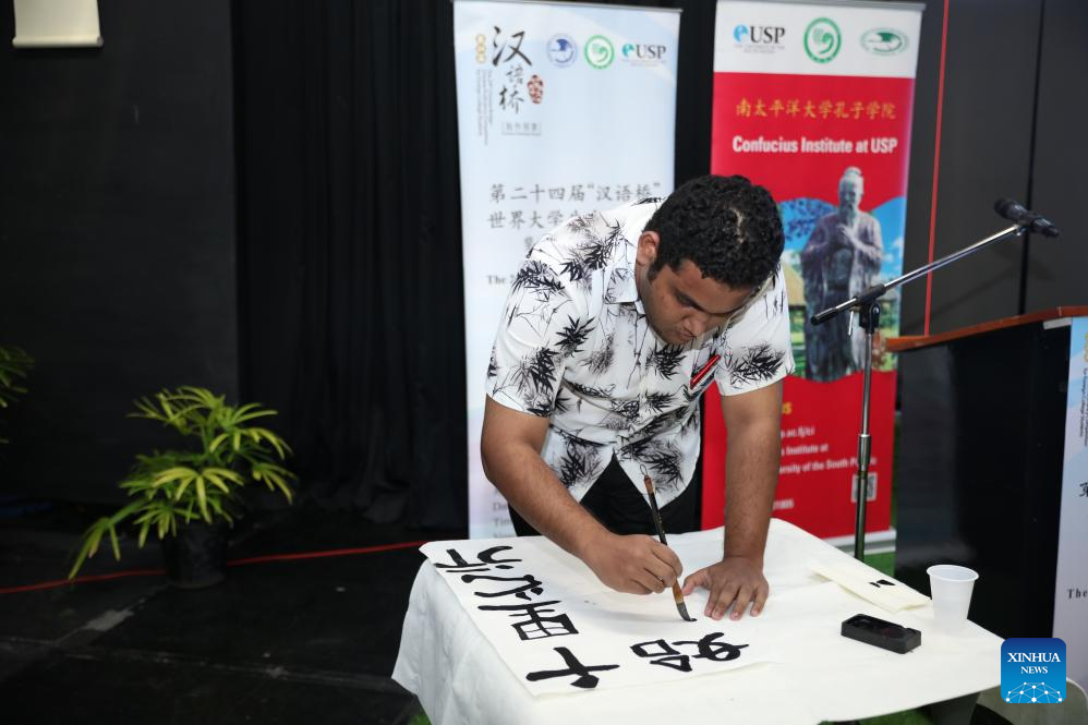 A contestant performs Chinese calligraphy during the 24th "Chinese Bridge" Chinese Proficiency Competition for college students in Suva, Fiji, June 6, 2025. (Photo by Gao Xin/Xinhua)