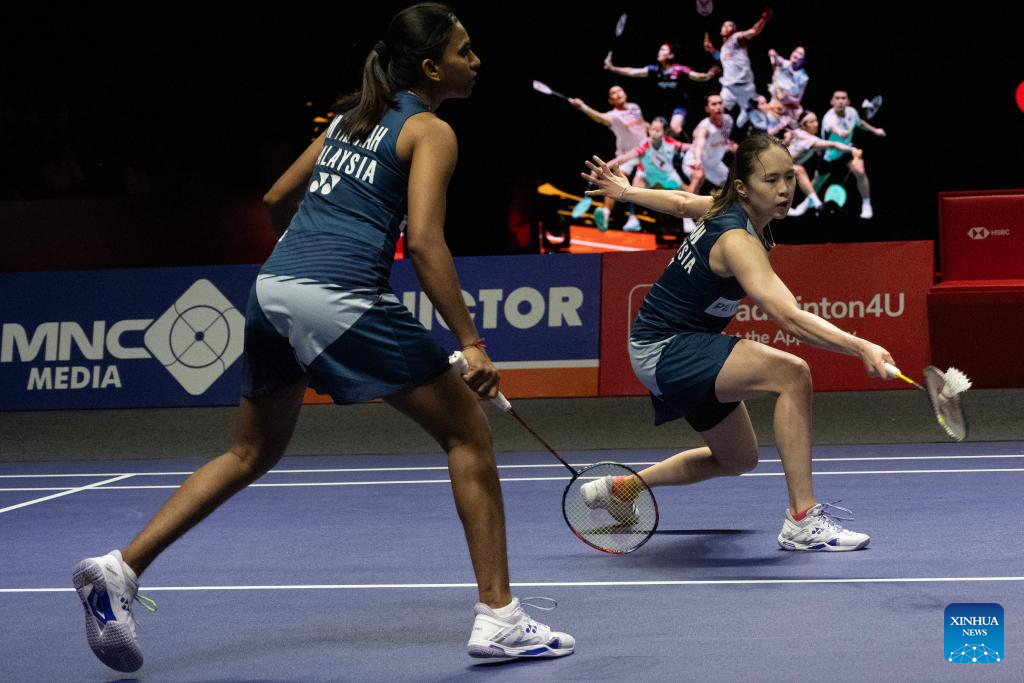 Pearly Tan (R)/Muralitharan Thinaah of Malaysia compete against Li Yijing/Luo Xumin of China during their women's doubles semifinal match at Indonesia Open 2025 badminton tournament in Jakarta, Indonesia, June 7, 2025. (Xinhua/Veri Sanovri)