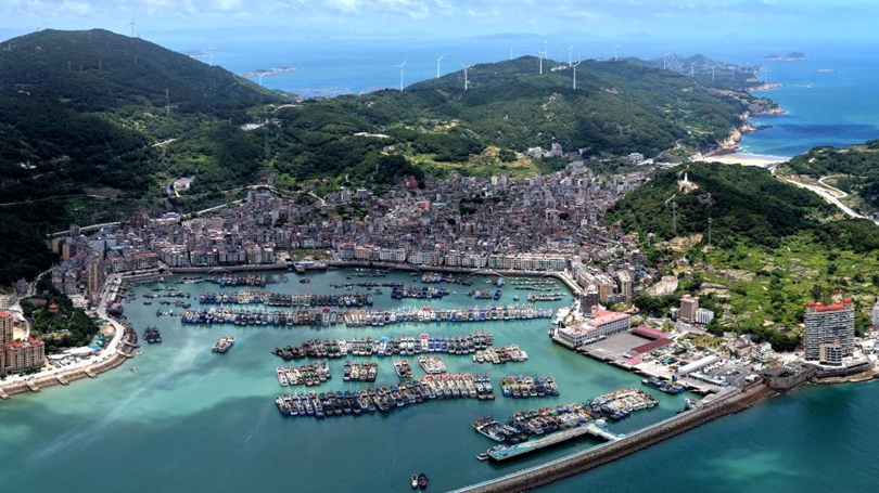 This aerial drone photo taken on July 6, 2025 shows vessels mooring at a port to shelter from an approaching typhoon in Fuzhou, southeast China's Fujian province. [Photo/Xinhua]
