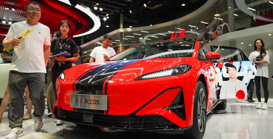 A Hongqi Tiangong 05 electric car is displayed at the 22nd Changchun International Auto Expo in Changchun, northeast China's Jilin Province, July 12, 2025. [Photo/Xinhua]