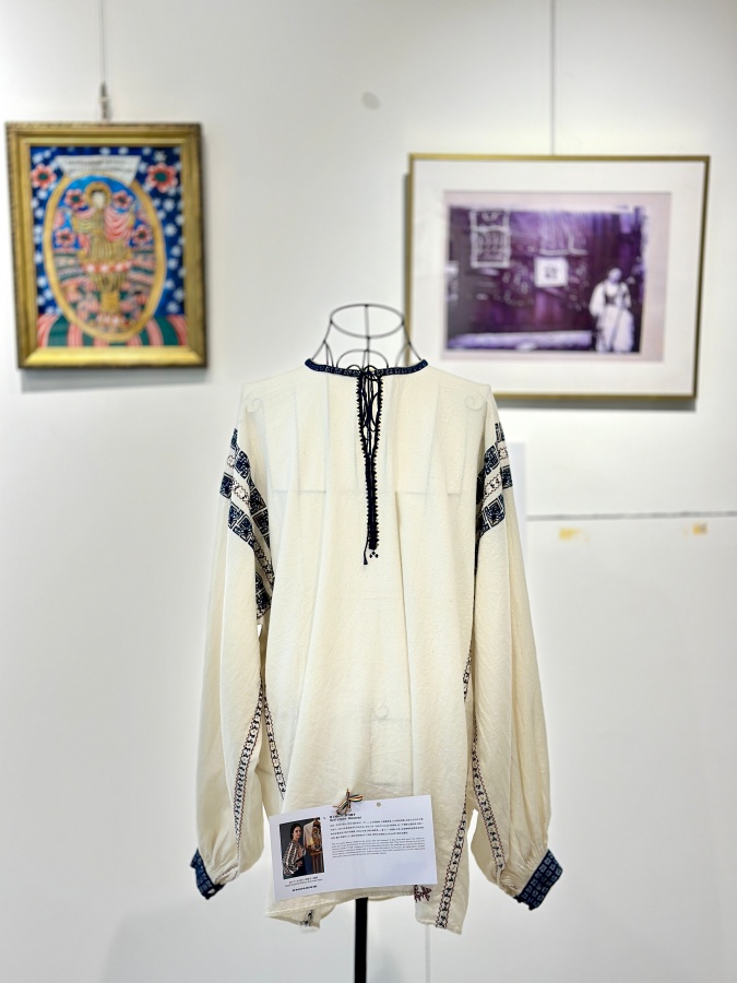 A matching men's shirt from Romanati sewn by Raluca Jurcovan Paun for her husband on display at the Romanian Cultural Institute in Beijing, July 9, 2025. The shirt features straja, a protective motif embroidered as a symbolic shield. [Photo by Liu Ziying/China.org.cn]