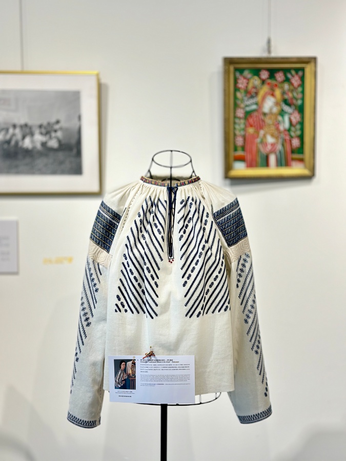 A Romanati blouse made by Raluca Jurcovan Paun on display at the Romanian Cultural Institute in Beijing, July 9, 2025. The design evokes the Black Sea and was created to be worn with a matching men's shirt. Golden threads and touches of the Romanian tricolor give the piece a special meaning. [Photo by Liu Ziying/China.org.cn]