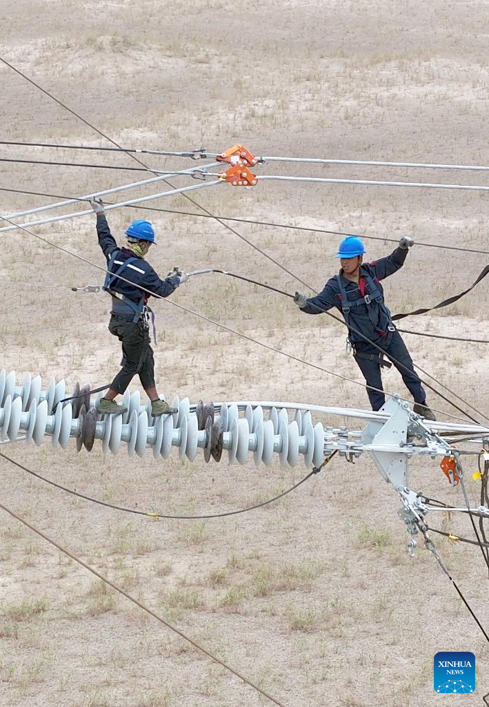 A drone photo shows Chen Lin (R) operating on a power transmission tower at a construction site in Minfeng County, of Hotan Prefecture, northwest China's Xinjiang Uygur Autonomous Region, July 12, 2025.(Photo by Zhang Limin/Xinhua)