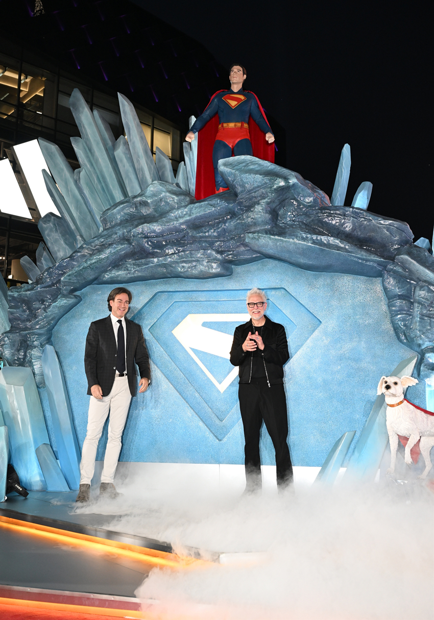 Peter Safran and James Gunn, co-chairmen and co-CEOs of DC Studios, light up an installation inspired by Superman's Arctic headquarters at the China premiere of "Superman" in Beijing, July 10, 2025. [Photo courtesy of Warner Bros. Discovery]