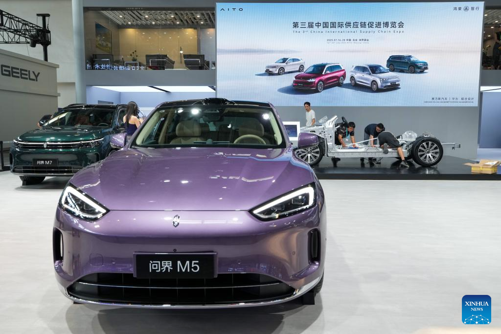 This photo taken on July 14, 2025 shows an AITO M5 vehicle at the smart vehicles section of the upcoming third China International Supply Chain Expo (CISCE) in Beijing, capital of China. (Xinhua/Ju Huanzong)