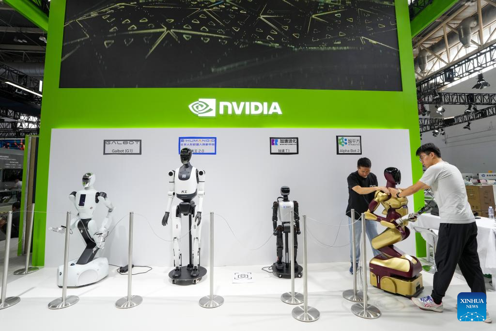 Staff members work at the booth of Nvidia at the digital technology section of the upcoming third China International Supply Chain Expo (CISCE) in Beijing, capital of China, July 14, 2025. (Xinhua/Ju Huanzong)