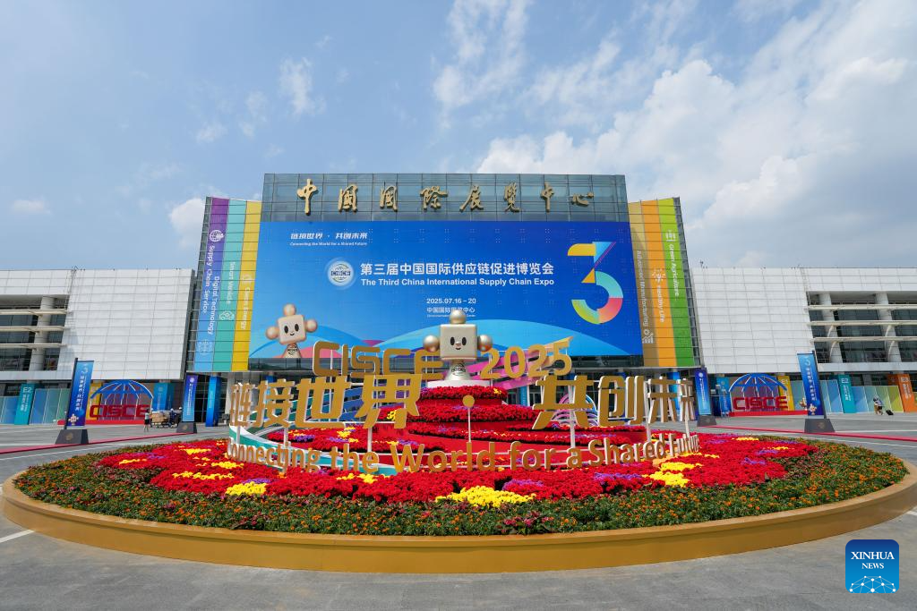 This photo taken on July 14, 2025 shows an exterior view of the venue for the upcoming third China International Supply Chain Expo (CISCE) in Beijing, capital of China. (Xinhua/Ju Huanzong)