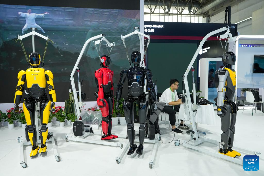 A staff member works at an exhibition area for humanoid robot industrial chain of Hubei Province at the digital technology section of the upcoming third China International Supply Chain Expo (CISCE) in Beijing, capital of China, July 14, 2025. (Xinhua/Ju Huanzong)