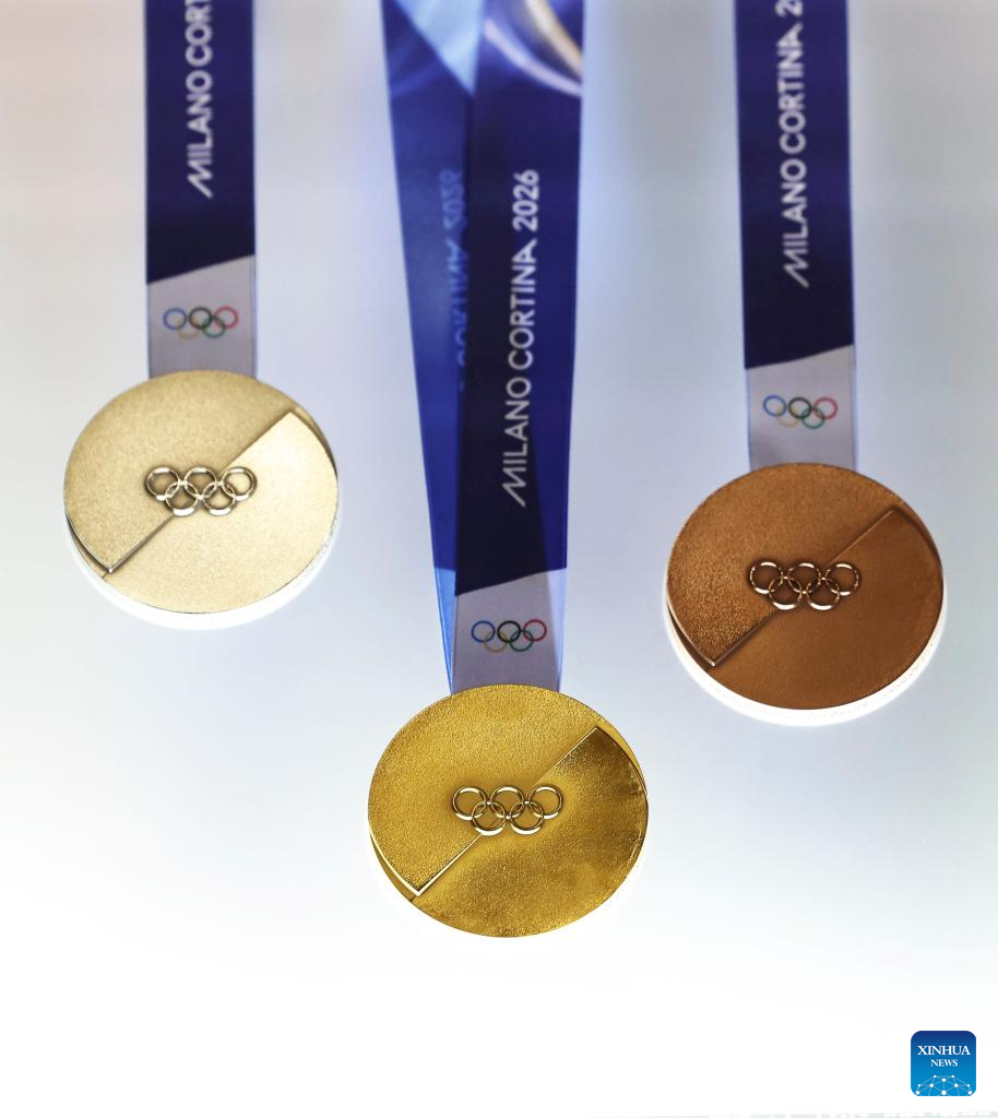 The medals for Milano Cortina 2026 Olympic Winter Games are displayed during the unveiling ceremony in Palazzo Balbi, Venice, Italy, on July 15, 2025. (Xinhua/Li Jing)