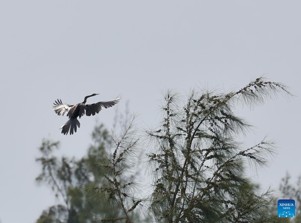 An Oriental Darter is pictured at Haiwei National Wetland Park in Changjiang Li Autonomous County, south China's Hainan Province, on July 11, 2025. An Oriental Darter (Anhinga melanogaster) has recently been observed for the first time in Hainan Province. The bird species is listed as near threatened on the IUCN Red List of Threatened Species and is extremely rare in China. (Photo by Xue Meili/Xinhua)