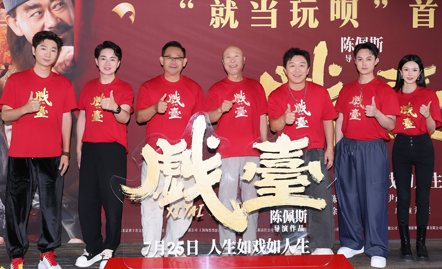 The cast and crew of "The Stage" pose for a photo at the film's premiere in Beijing, July 14, 2025. [Photo courtesy of PFDM Media]