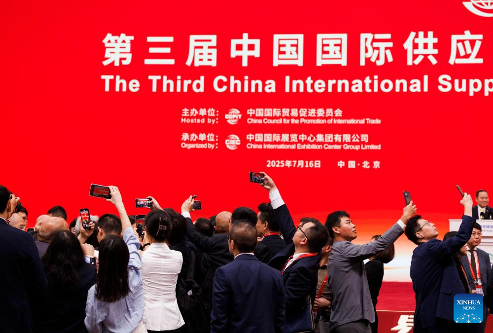 Media professionals take photos at the opening ceremony of the third China International Supply Chain Expo (CISCE) in Beijing, capital of China, July 16, 2025. (Xinhua/Jin Liwang)