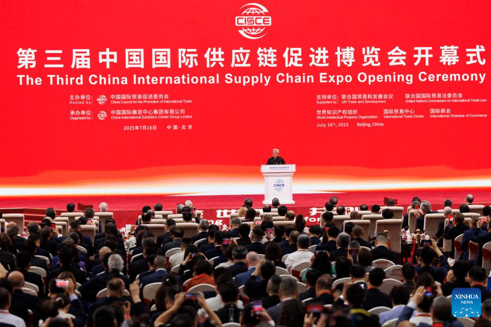 Nvidia CEO Jensen Huang delivers a speech at the opening ceremony of the third China International Supply Chain Expo (CISCE) in Beijing, capital of China, July 16, 2025. [Photo/Xinhua]