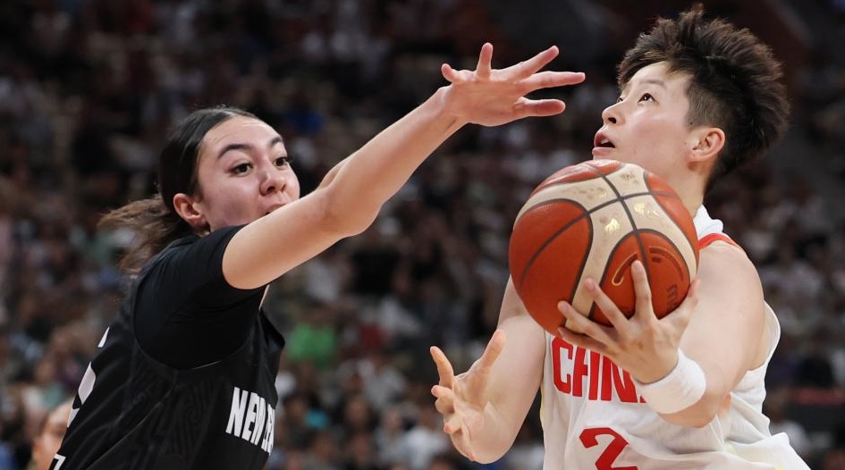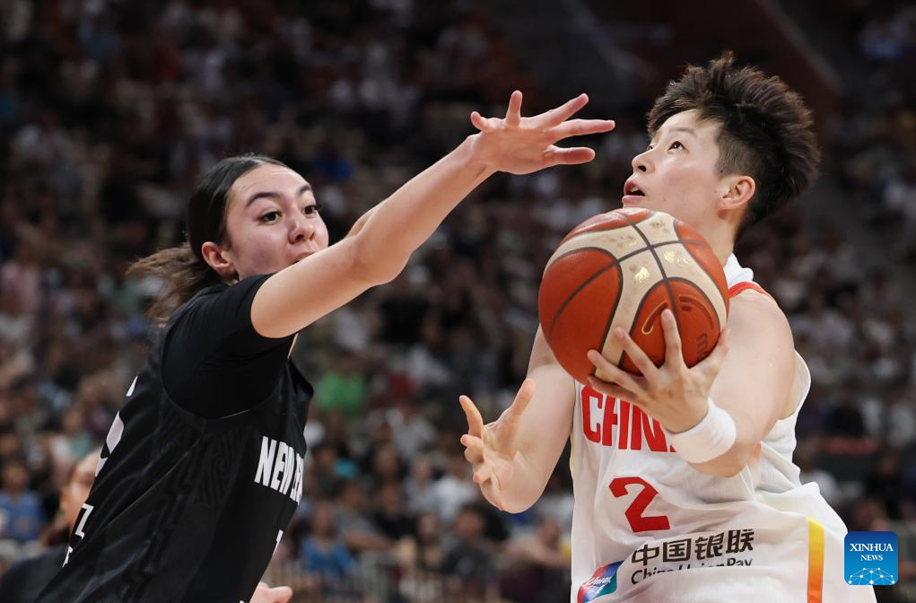 Li Yuan (R) of China goes for a lay-up during the Group A match between China and New Zealand at the FIBA Women's Asia Cup Division A 2025 in Shenzhen, south China's Guangdong Province, July 16, 2025. (Xinhua/Liang Xu)