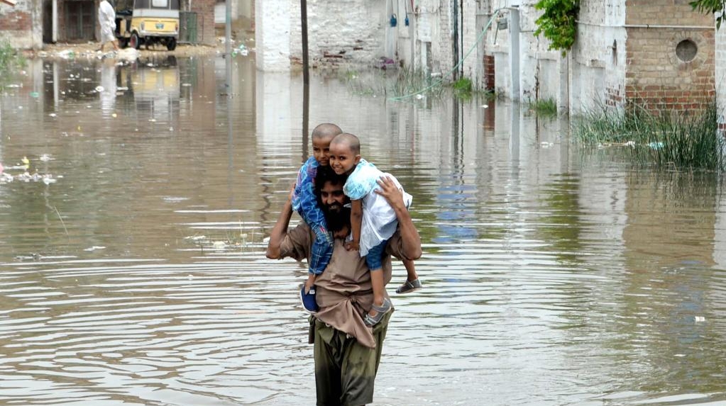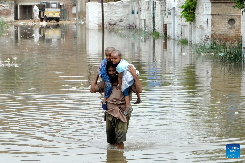 A man carries his children as he wades through flood water after heavy monsoon rains in southern Pakistan's Hyderabad on July 15, 2025. [Photo/Xinhua]