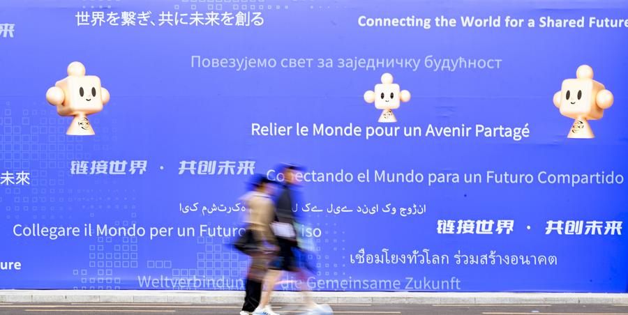 People walk past a poster during the third China International Supply Chain Expo (CISCE) in Beijing, capital of China, July 16, 2025. [Photo/Xinhua]