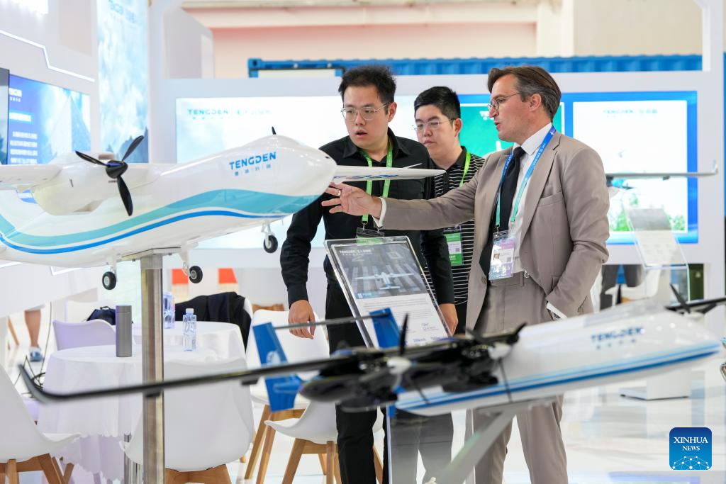 A visitor (R) learns about drone products at the Advanced Manufacturing Chain area during the third China International Supply Chain Expo (CISCE) in Beijing, capital of China, July 16, 2025. [Photo/Xinhua]