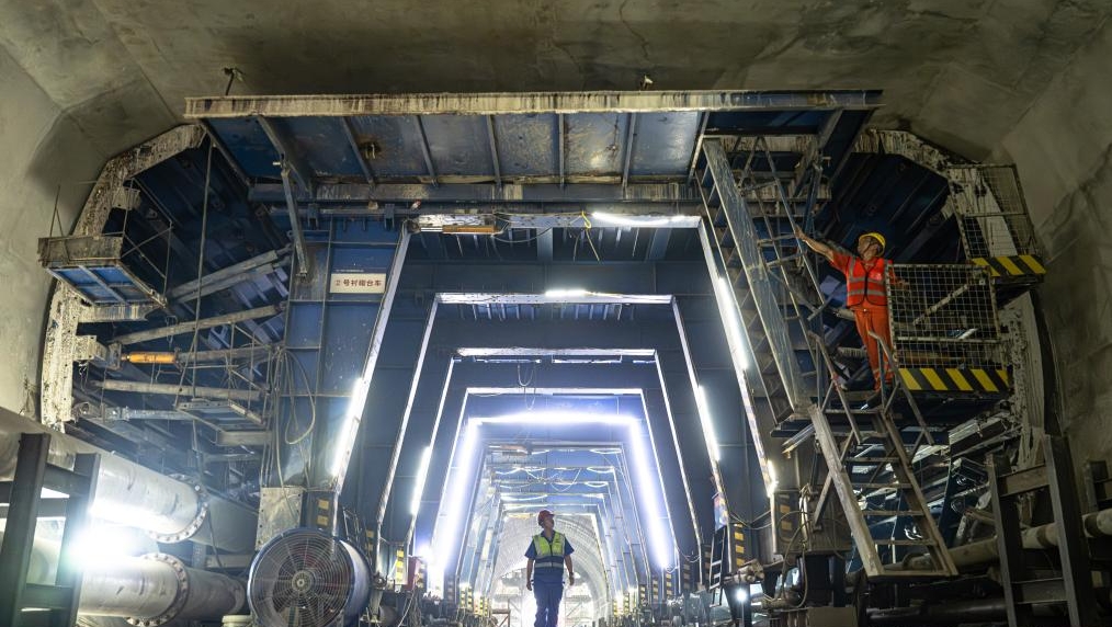 Constructors work in the Yangtze River tunnel of the Wuhan Metro Line 12 in Wuhan, central China's Hubei Province, July 16, 2025. The 4,011-meter Yangtze River tunnel of the Wuhan Metro Line 12 achieved a tunnelling breakthrough on Wednesday. The 59.9-kilometer metro line is the longest loop metro line in the country. (Xinhua/Xiao Yijiu)
