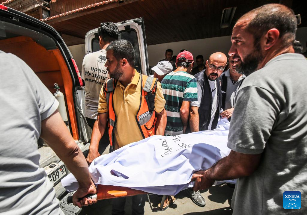 Palestinians carry the body of a victim after an Israeli drone strike on the Holy Family church, at the Baptist Hospital in Gaza City, on July 17, 2025. [Photo/Xinhua]