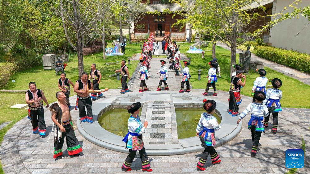 A drone photo taken on July 18, 2025 shows members of a local Yizu Dage team attending a rehearsal in Weishan Yi and Hui Autonomous County, Dali Bai Autonomous Prefecture, southwest China's Yunnan province. [Photo/Xinhua]