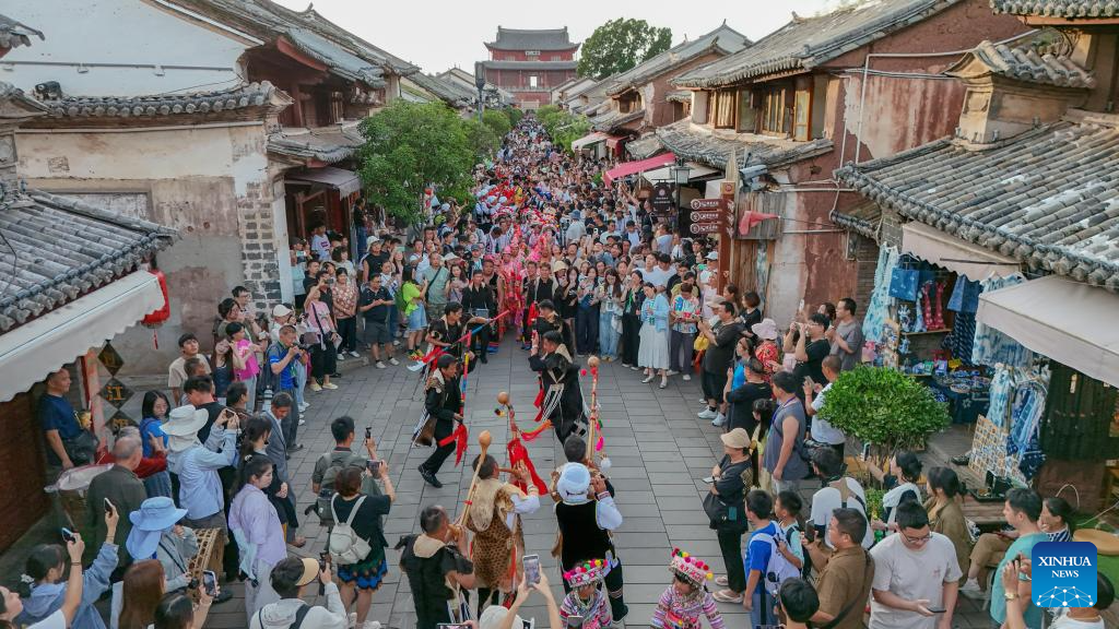 A drone photo taken on July 18, 2025 shows a local Yizu Dage team performing during a parade show on the ancient street of Nanzhao in Weishan Yi and Hui Autonomous County, Dali Bai Autonomous Prefecture, southwest China's Yunnan province. [Photo/Xinhua]