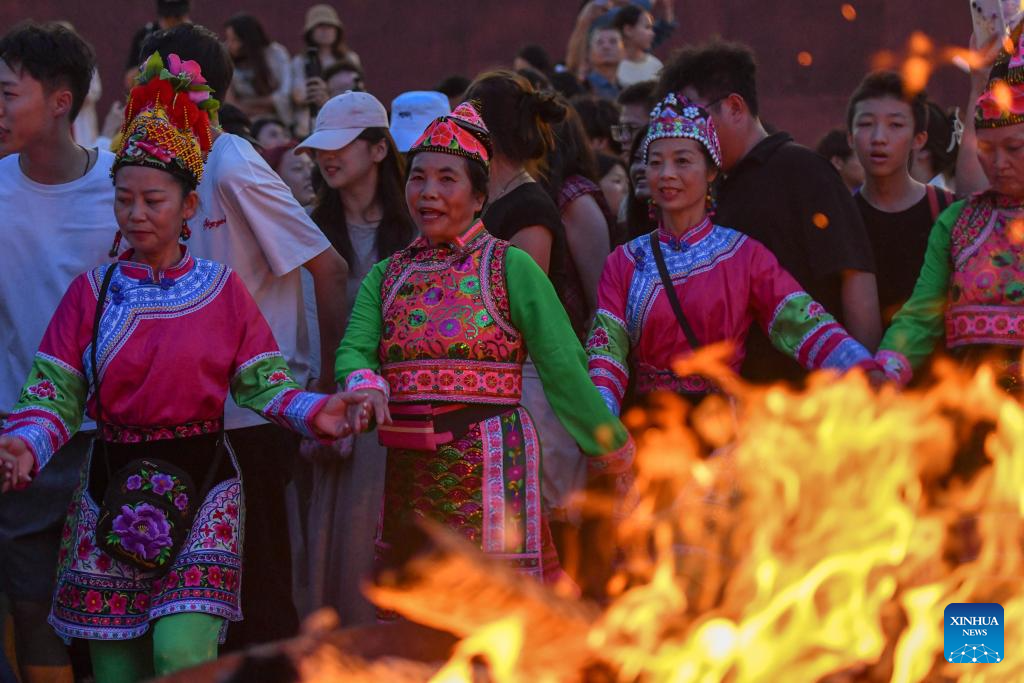 Members of a local Yizu Dage team dance with tourists during a parade show on a square in Weishan Yi and Hui Autonomous County, Dali Bai Autonomous Prefecture, southwest China's Yunnan province, July 18, 2025. [Photo/Xinhua]