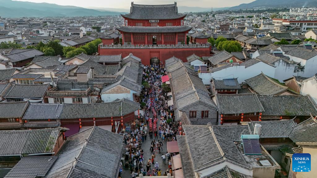 An aerial drone photo taken on July 18, 2025 shows a local Yizu Dage team performing during a parade show on the ancient street of Nanzhao in Weishan Yi and Hui Autonomous County, Dali Bai Autonomous Prefecture, southwest China's Yunnan province. [Photo/Xinhua]