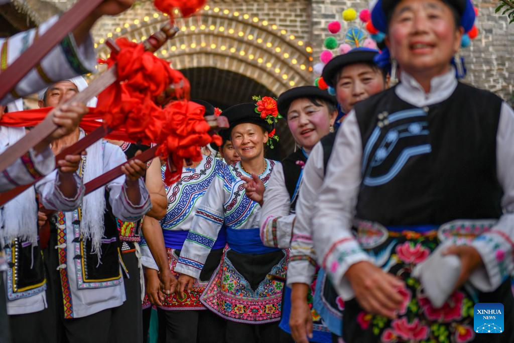 Members of a local Yizu Dage team perform during a parade show on the ancient street of Nanzhao in Weishan Yi and Hui Autonomous County, Dali Bai Autonomous Prefecture, southwest China's Yunnan province, July 18, 2025. [Photo/Xinhua]
