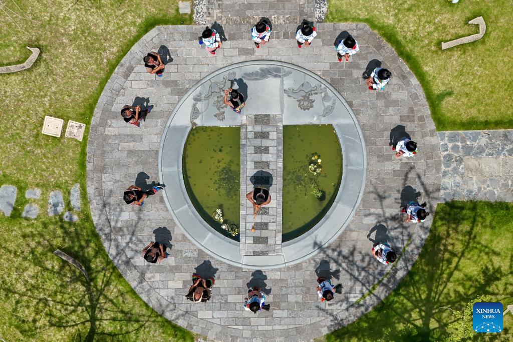 An aerial drone photo taken on July 18, 2025 shows a local Yizu Dage team attending a rehearsal in Weishan Yi and Hui Autonomous County, Dali Bai Autonomous Prefecture, southwest China's Yunnan province. [Photo/Xinhua]