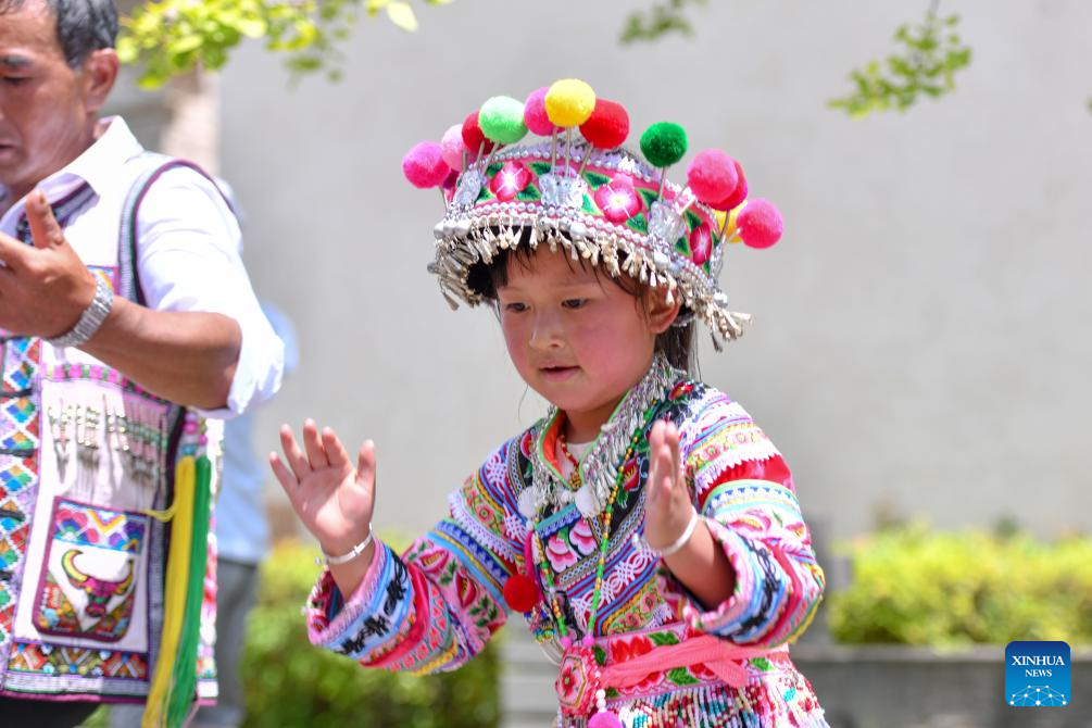 A young member of a local Yizu Dage team attends a rehearsal in Weishan Yi and Hui Autonomous County, Dali Bai Autonomous Prefecture, southwest China's Yunnan province, July 18, 2025. [Photo/Xinhua]