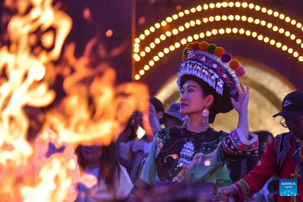 A tourist in traditional costume of Yi ethnic group tries Yizu Dage on a square in Weishan Yi and Hui Autonomous County, Dali Bai Autonomous Prefecture, southwest China's Yunnan province, July 18, 2025. [Photo/Xinhua]