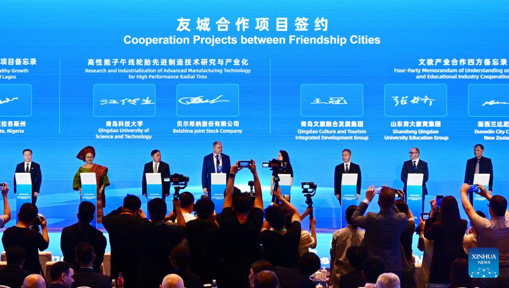 Guests attend the signing ceremony of Cooperation Projects between Friendship Cities during the opening ceremony of the Qingdao International Friendship Cities Exchange Month in Qingdao, east China's Shandong Province, July 19, 2025. Qingdao International Friendship Cities Exchange Month opened here on Saturday, bringing together representatives of 19 cities and institutions from 17 countries, aiming to expand the cultural and tourism exchanges and explore paths for industrial cooperation. (Xinhua/Li Ziheng)