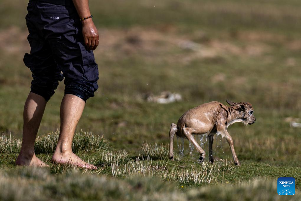 A stranded Tibetan antelope calf is rescued by a ranger in Changtang National Nature Reserve in southwest China's Xizang Autonomous Region, July 14, 2025. The Senlong Zangbo River, located in Changtang National Nature Reserve in Nagqu, is a vital migration route for Tibetan antelopes. Each July, Tibetan antelope calves and their mothers cross the river and migrate to their habitats. Over the past three years, the number of Tibetan antelope migrating across this river has exceeded 150,000 each year.