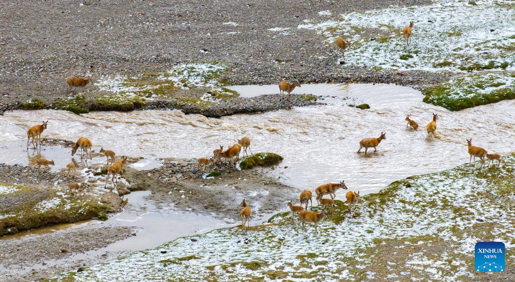 This aerial drone photo shows Tibetan antelopes crossing the Senlong Zangbo River in Changtang National Nature Reserve in southwest China's Xizang Autonomous Region, July 14, 2025. The Senlong Zangbo River, located in Changtang National Nature Reserve in Nagqu, is a vital migration route for Tibetan antelopes. Each July, Tibetan antelope calves and their mothers cross the river and migrate to their habitats. Over the past three years, the number of Tibetan antelope migrating across this river has exceeded 150,000 each year.