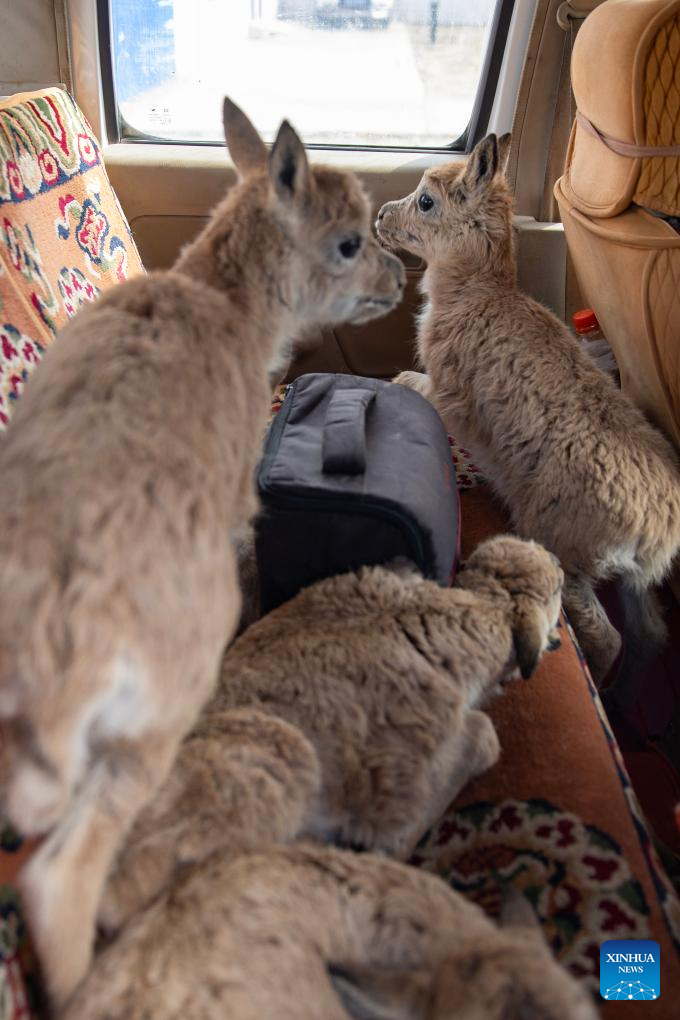 Rescued Tibetan antelope calves rest in a car in Changtang National Nature Reserve in southwest China's Xizang Autonomous Region, July 14, 2025. The Senlong Zangbo River, located in Changtang National Nature Reserve in Nagqu, is a vital migration route for Tibetan antelopes. Each July, Tibetan antelope calves and their mothers cross the river and migrate to their habitats. Over the past three years, the number of Tibetan antelope migrating across this river has exceeded 150,000 each year.