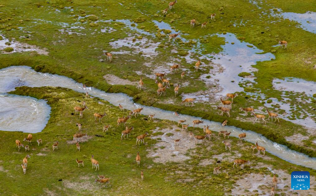 This aerial drone photo shows Tibetan antelopes crossing the Senlong Zangbo River in Changtang National Nature Reserve in southwest China's Xizang Autonomous Region, July 14, 2025. The Senlong Zangbo River, located in Changtang National Nature Reserve in Nagqu, is a vital migration route for Tibetan antelopes. Each July, Tibetan antelope calves and their mothers cross the river and migrate to their habitats. Over the past three years, the number of Tibetan antelope migrating across this river has exceeded 150,000 each year.