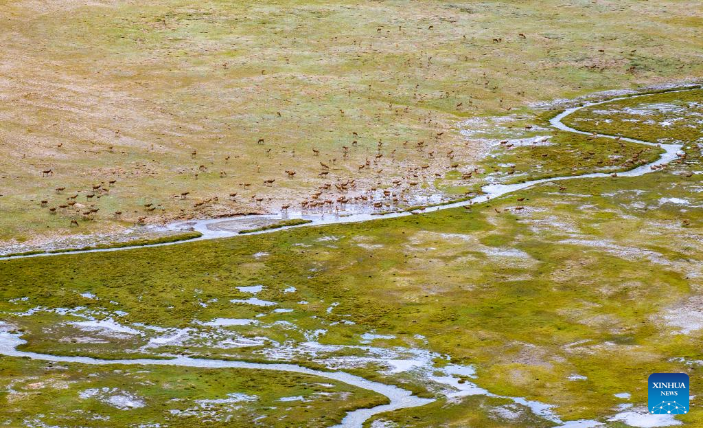 This aerial drone photo taken on July 14, 2025 shows Tibetan antelopes crossing the Senlong Zangbo River in Changtang National Nature Reserve in southwest China's Xizang Autonomous Region. The Senlong Zangbo River, located in Changtang National Nature Reserve in Nagqu, is a vital migration route for Tibetan antelopes. Each July, Tibetan antelope calves and their mothers cross the river and migrate to their habitats. Over the past three years, the number of Tibetan antelope migrating across this river has exceeded 150,000 each year.
